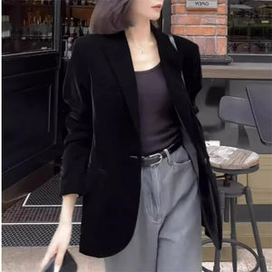 Autumn New Black Velvet Women's Blazer Fashion Long Sleeve Single Button Casual Loose Temperament Suit Top Female Outerwear