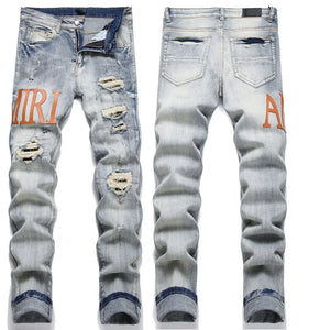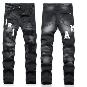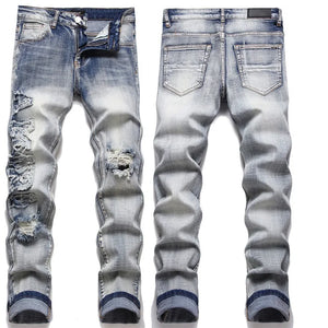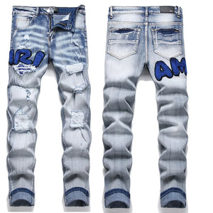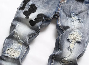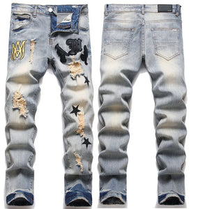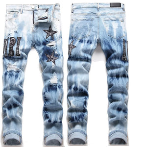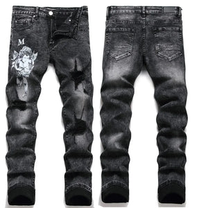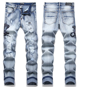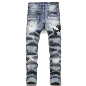 High Street Stretch Embroidery Men’s Jeans Ripped Streetwear Jeans Punk Style Pants for Man Slim Fashion Small Feet Men's Jeans