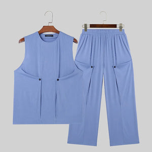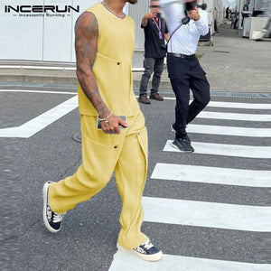 INCERUN Men Sets Solid Color Streetwear O-neck Sleeveless Tank Tops & Pants 2PCS Summer Loose Fashion Men's Casual Suits S-2XL