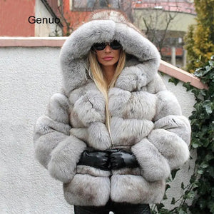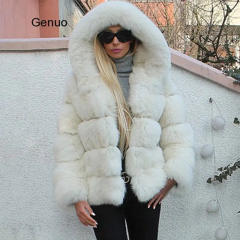 Luxury Faux Fox Fur Coat Women Short Winter Jacket with Big Fur Hood Thick Warm Overcoat 2020 New Fashion Flurry Fake Fur Coats