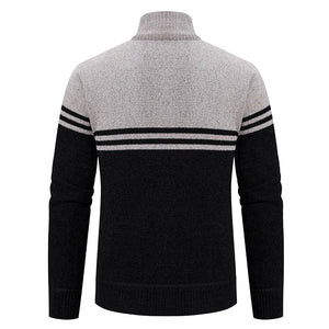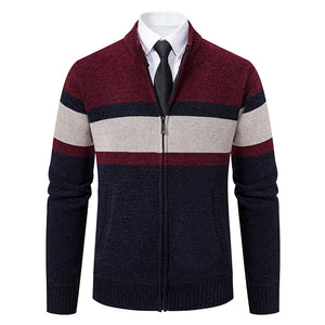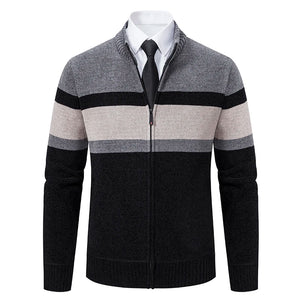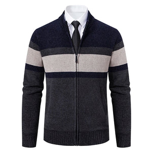 Men's New Winter Sweater Thick Fleece Warm Sweater Casual Stand Collar Zipper Cardigan Fashion Striped Coat