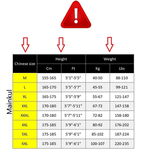 55-67kg for XL, 45-55kg for L, 40-50kg for M, 100-107kg for 6XL, 85-102kg for 5XL, 80-92kg for 4XL, 72-82kg for XXXL, 65-72kg for XXL