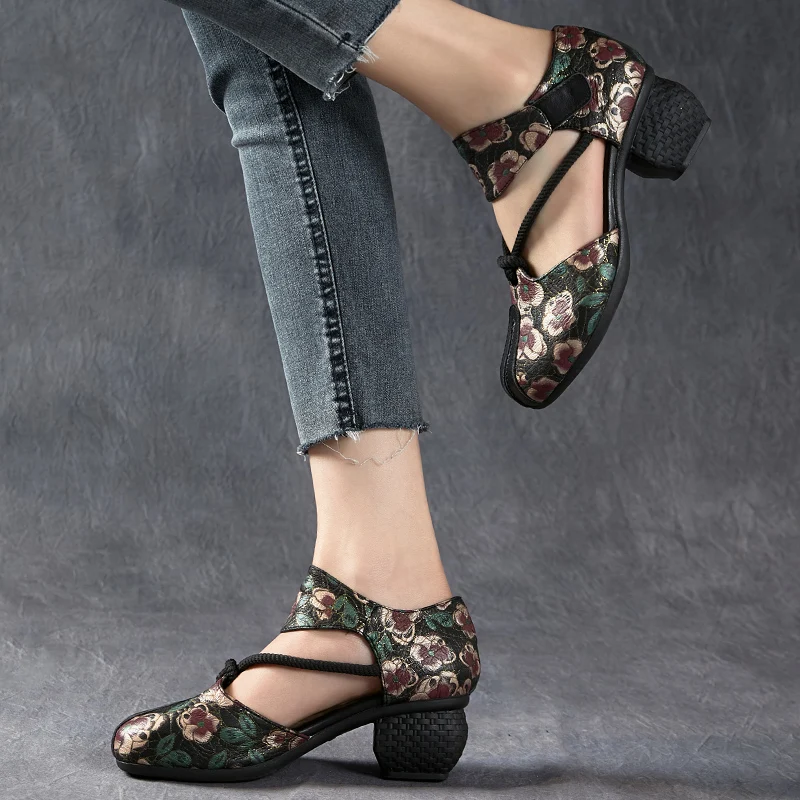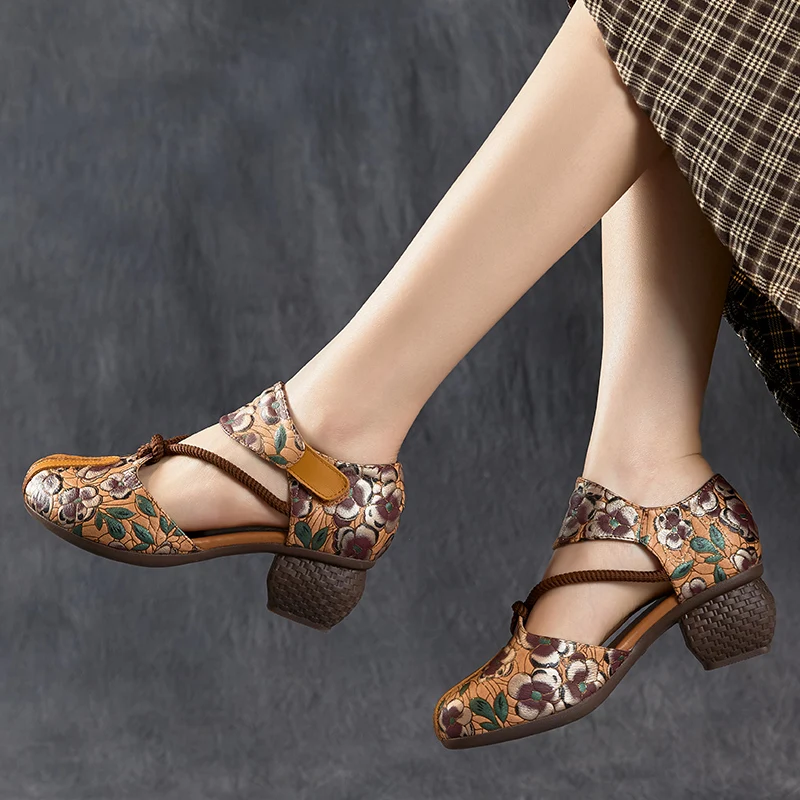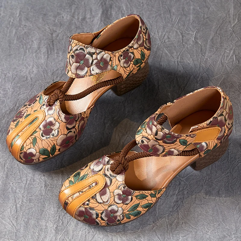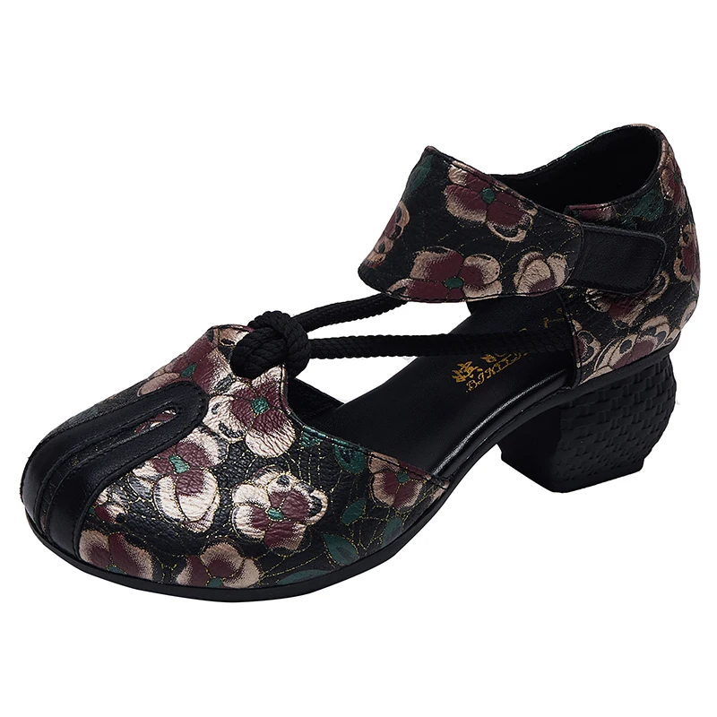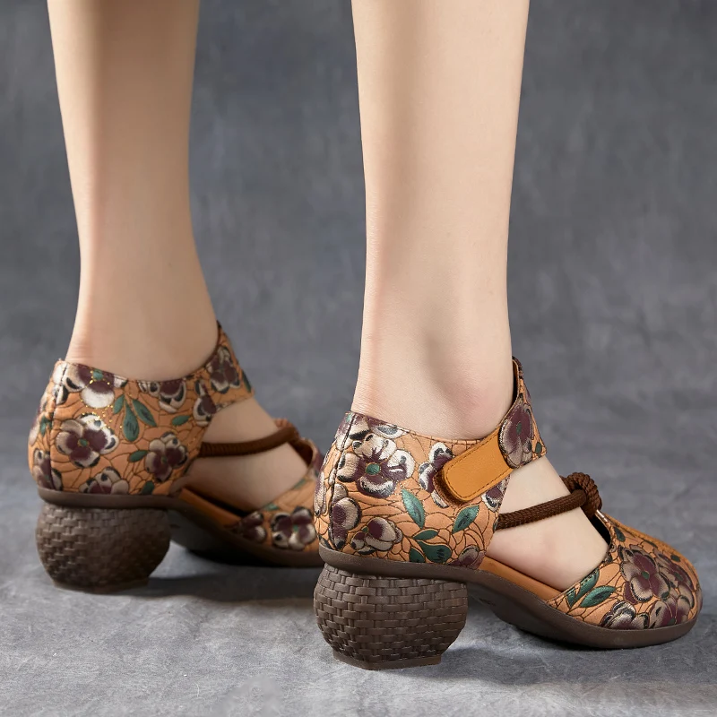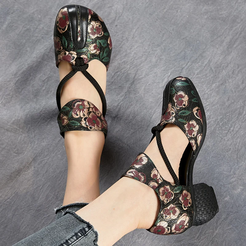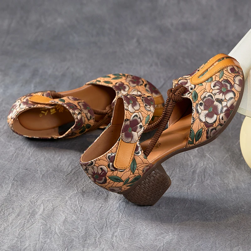 New Women Sandals Summer Genuine Leather Print Thick Heels Sandals Retro Style Round Toe Casual High Heel Shoes