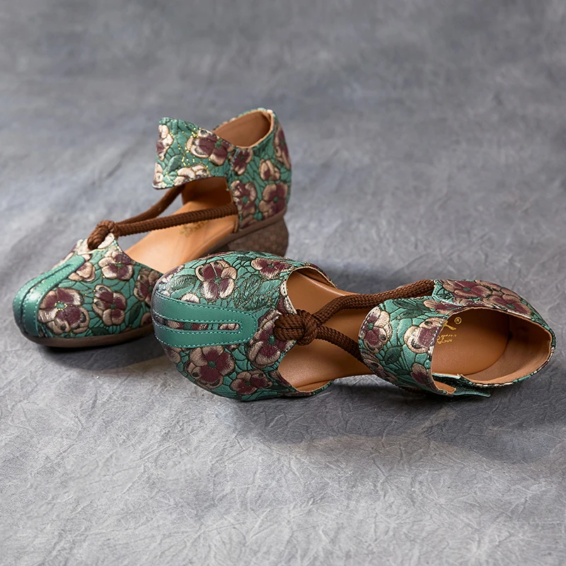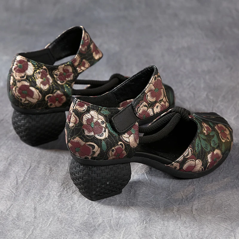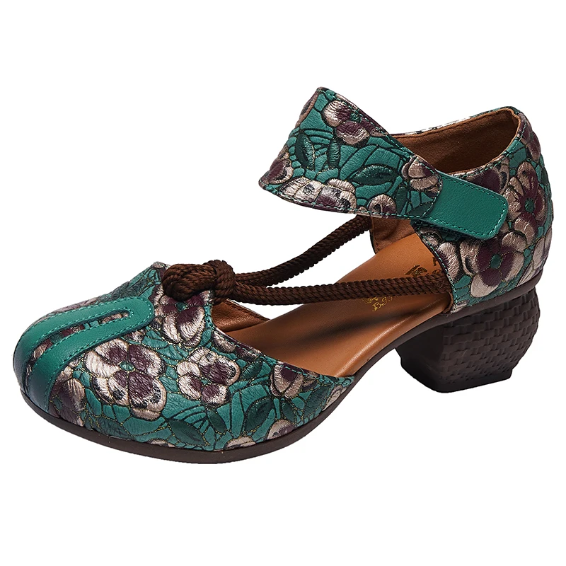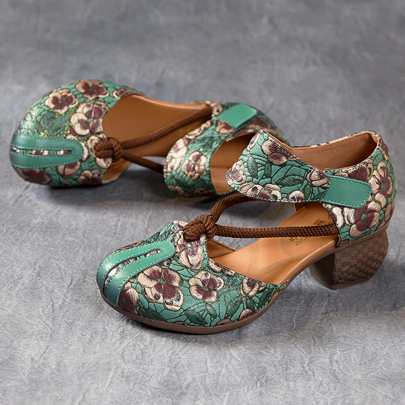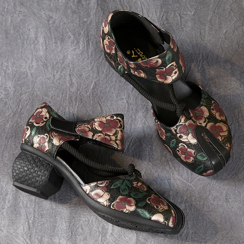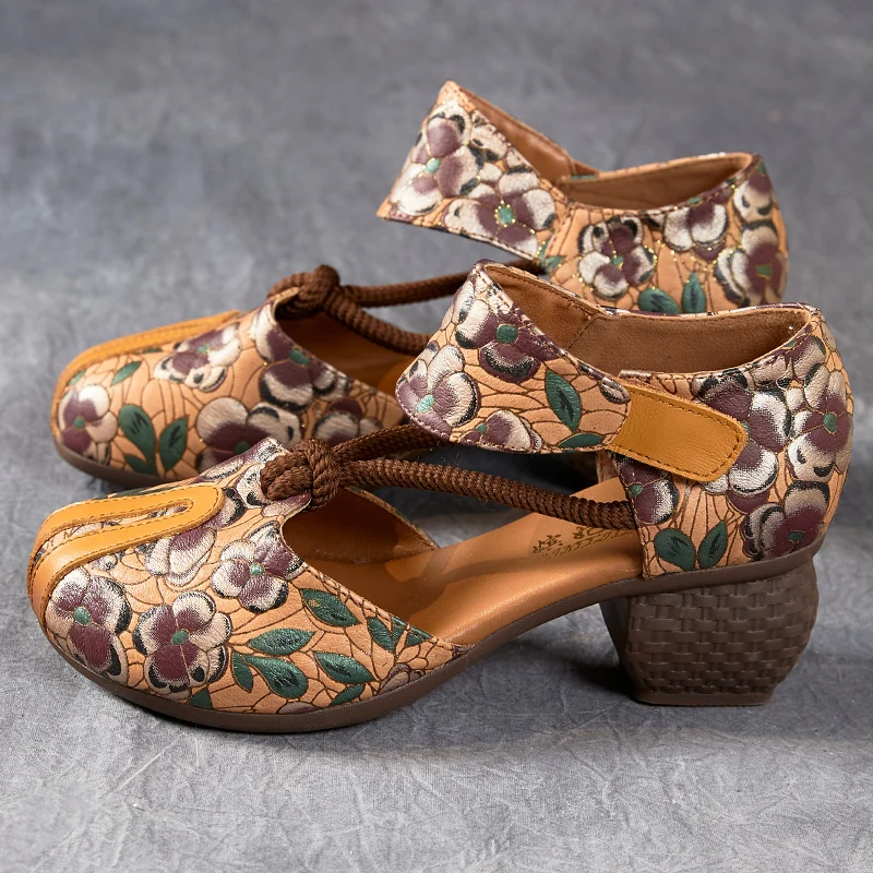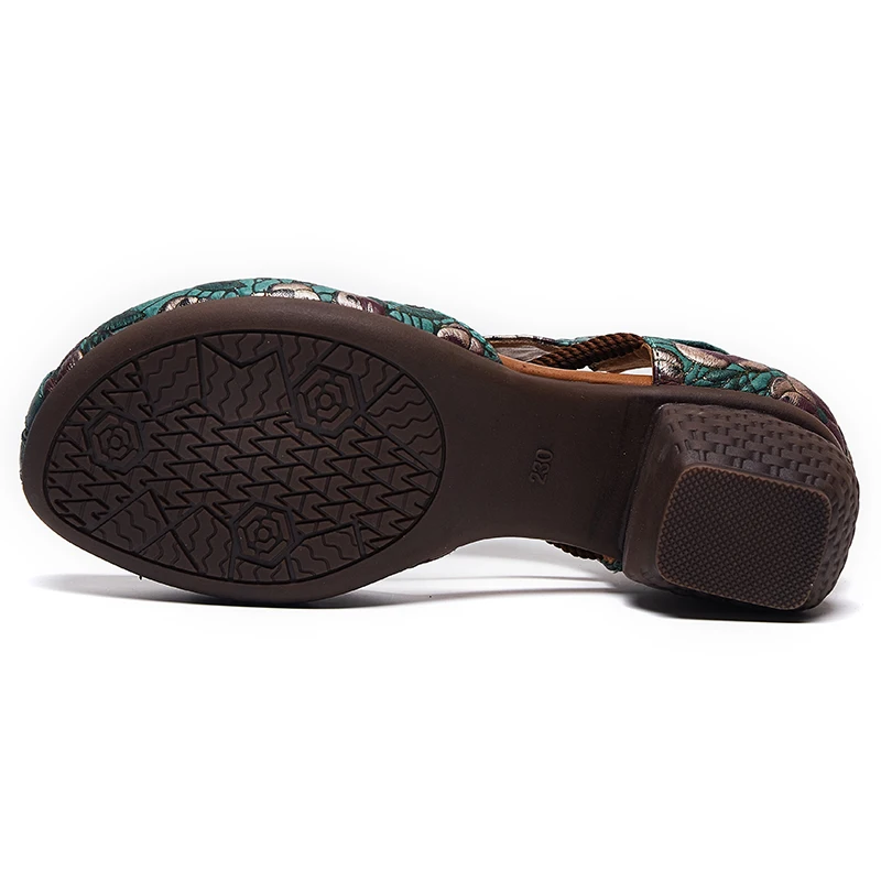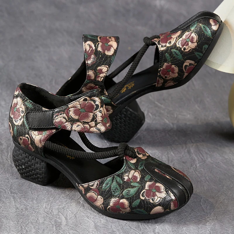 New Women Sandals Summer Genuine Leather Print Thick Heels Sandals Retro Style Round Toe Casual High Heel Shoes