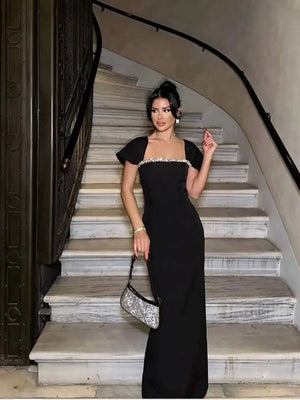 New Women's Short Sleevel Square Neck Diamonds Bandage Dress Floor Length Bodycon Fashion Celebrity Party Maxi Dress