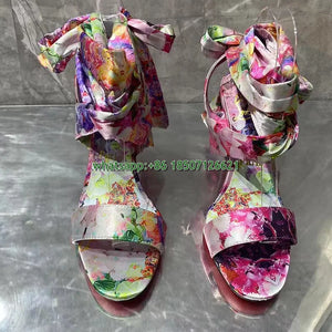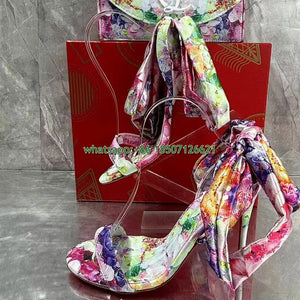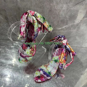 Printed Round Toe Ankle Strap Stiletto High Heels Open Toe Large Size Women's High Heels