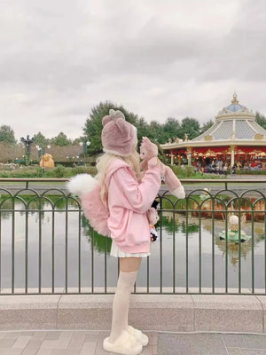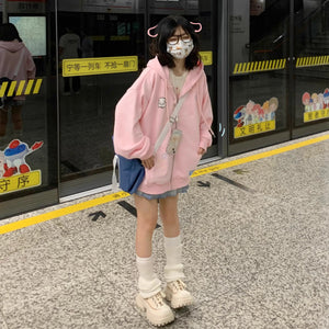Home QWEEK Harajuku Kawaii Pink Zip Up Hoodie Women Japanese Y2K Sweet Cute Beige Fleece Sweatshirts Korean Style Girly Hooded Jacket