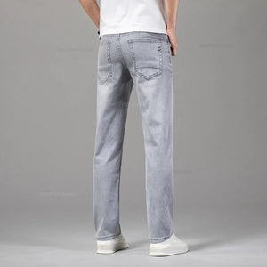 Summer Thin Men's Elastic Cotton Jeans Fashion Gray Comfortable Business Straight Casual Pants Brand Male Clothes Trousers