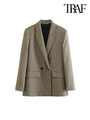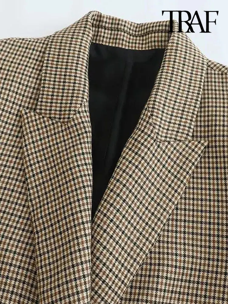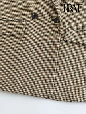 Home TRAF Women Fashion Double Breasted Plaid Blazer Coat Vintage Long Sleeve Flap Pockets Female Outerwear Chic Vestes Femme