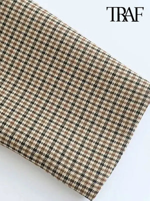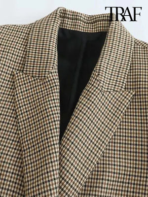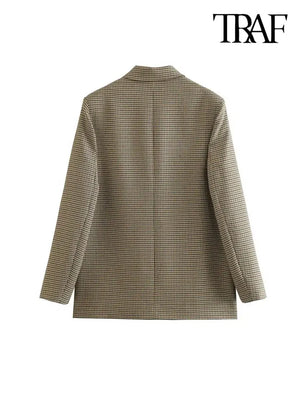 TRAF Women Fashion Double Breasted Plaid Blazer Coat Vintage Long Sleeve Flap Pockets Female Outerwear Chic Vestes Femme