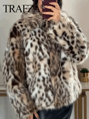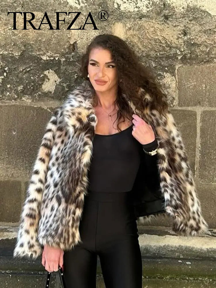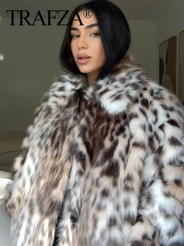 TRAFZA 2024 Woman Lapel Long Sleeves Side Pockets Casual Coat Women Winter Leopard Print Faux Fur Loose Slim Warm Coat Mujer
