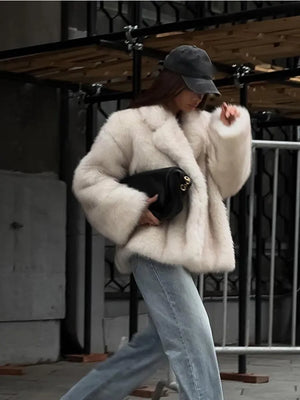 Women Autumn Winter Solid Fluffy Faux Fur Thick Coat Elegant Lapel Long Sleeves Short Overcoats 2024 New Warm Street Outerwear