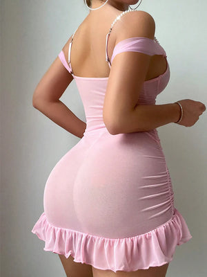 Women Night Dress Pearl Shoulder Sleeveless Pajamas Beautiful Tulle Ruffles Sexy Lingerie Floral Embroidery Sleepwear Home Dress