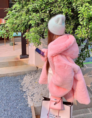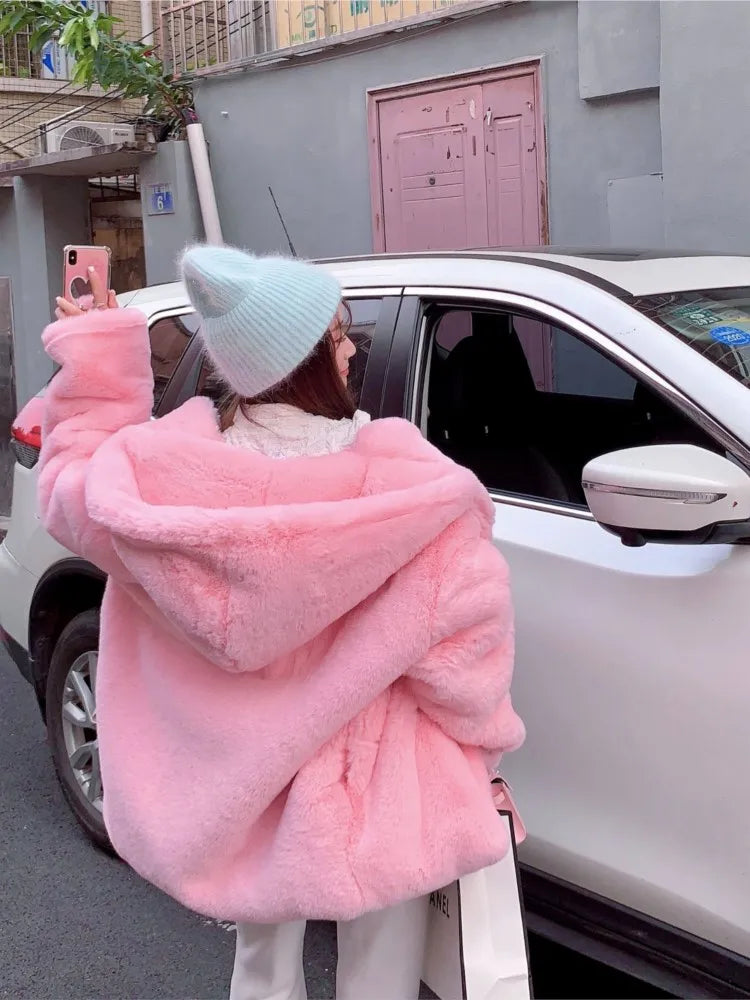 Women Sweet Pink Fur Coats Female Winter Thick Warm Streetwears Korean Hooded Fashion Oversize Outerwears
