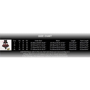 | Size:XL | US:10 | UK:14 | EU:40 | Under Bust:77-100cm/30.31-39.37'' | Waist:76-106cm/29.92-41.73'' | Length:24cm/9.45'' | Pants Length:21.5cm/8.46'' |