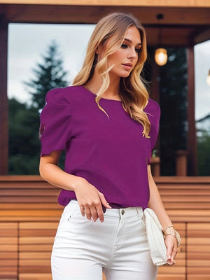 Solid Crew Neck Blouse, Elegant Ruched Sleeve Blouse For Spring & Summer, Women's Clothing