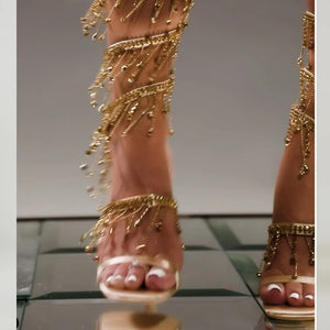 Eilyken Golden Crystal Rhinestone Women's Sandals Fashion String Bead Nightclub Stiletto Heel Wrap Strap Peep Toe Summer Shoes