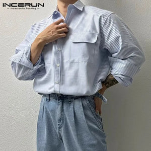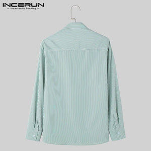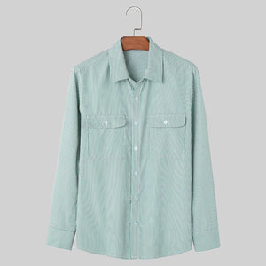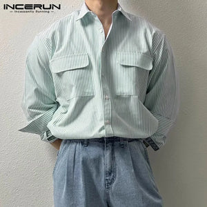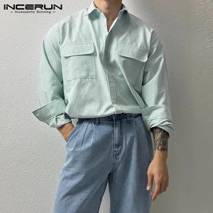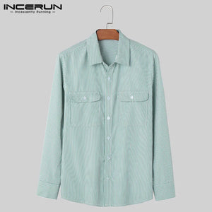INCERUN Tops Korean Style Men Double Pocket Design Striped Shirt Stylish Solid Well Fitting Lapel Long Sleeved Blouse S-5XL