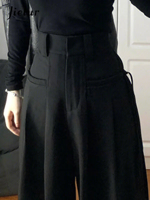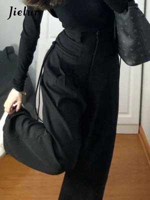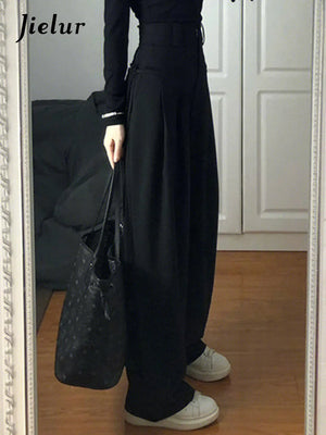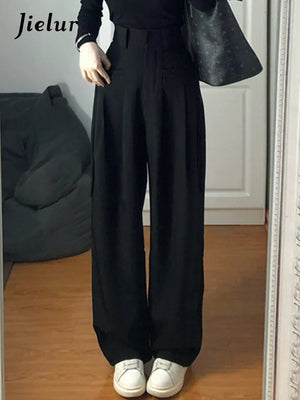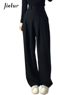 Jielur Simple Black High Waist Female Wide Leg Pants Full Length Casual Straight Solid Color Women's Suit Pants American Style