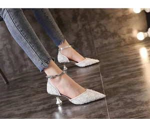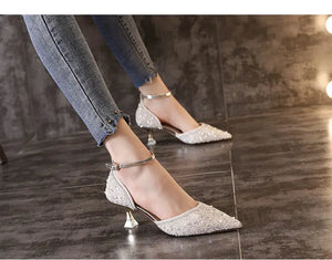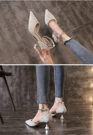Ladies Ankle Strap Pumps High Heels Crystal Wedding Shoes Bride for Women Spring Pointed Toe Luxury Pumps Woman
