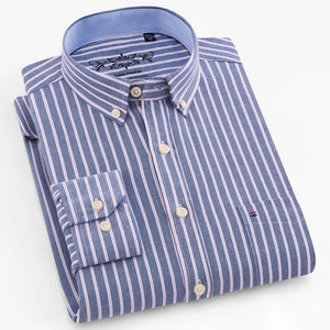 Men's Long Sleeve Oxford Plaid Striped Casual Shirt Front Patch Chest Pocket Regular-fit Button-down Collar Thick Work Shirts