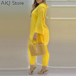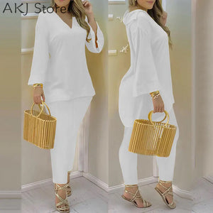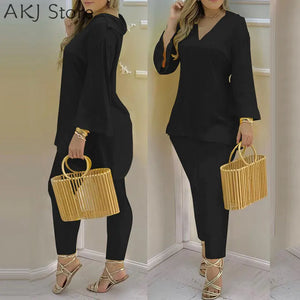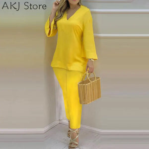 Summer Casaul Women Home Wear Solid Suit Sets Long Sleeve Plain Bell Sleeve V-Neck Top & Pants Set
