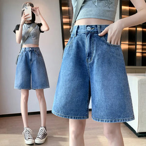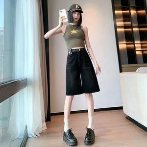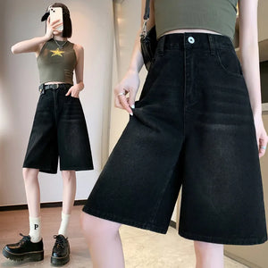 Women Black Y2k Style Baggy Denim Shorts Wide Leg Capri Pants Fashion High Waisted Dark Wash Jeans Female Casual Retro 2000s