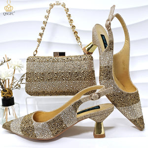 Women Heel Party Ladies Italian Design Green Shoes And Bag Set Decorated with Rhinestone Handbag Wedding Party