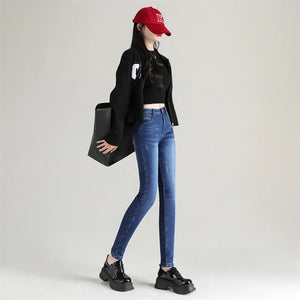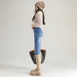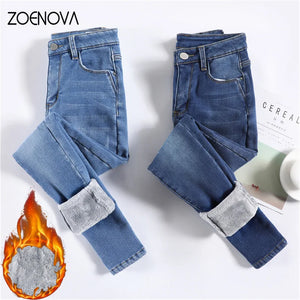 Women Thermal Jeans Winter Snow Warm Plush Stretch Jeans Lady Skinny Thicken Fleece Denim Long Pants Retro Blue Pencil Trousers