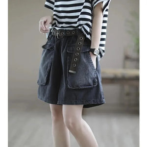 Women's Elastic Waist Sashes Solid Denim Shorts Summer New Korean Casual Fashion All-match Loose Pockets Wide Leg Trouser Skirts