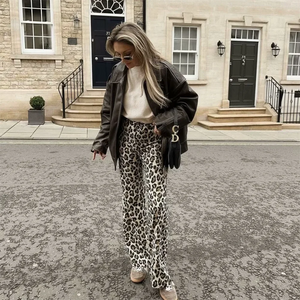 Home Women's Fashion and Casual Versatile Animal Print Straight Leg Pants Decorated Street Trousers Women's Slim Fit Zipper Trousers