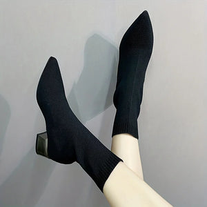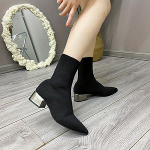 Women's Knitted Ankle Boots Pointed Toe Stretchy Chunky med Heels Fashion Sock Short Botas