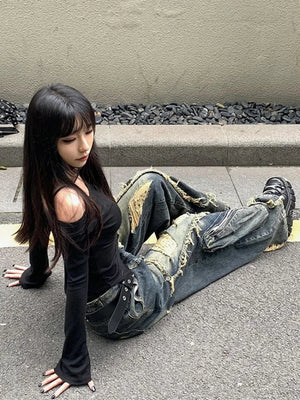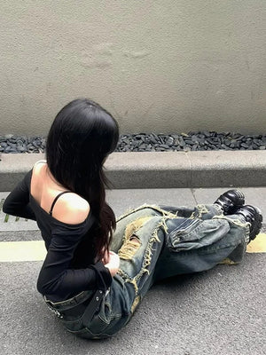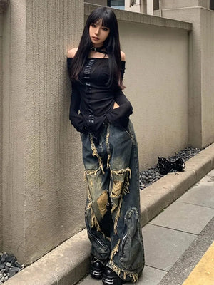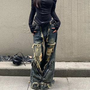 Y2K High Street Ripped Tassel Washed Baggy Jeans Woman Retro Street Hip-hop Loose Old Fashion Casual High Waist Wide Leg Jeans