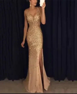 2024 Autumn Winter New European American Cross-border Amazon Side Slit Gold-embellished Long Evening Dress Sleeveless