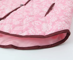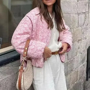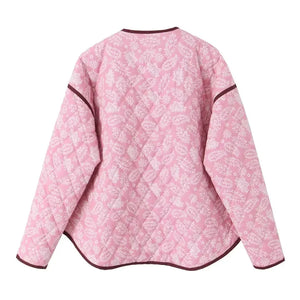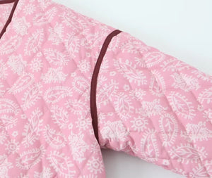 2024 Retro Winter Pink Flower Print Quilted Coat Ethnic Women V neck Quilting Full Sleeve Loose Oversized Jacket boho Outerwear
