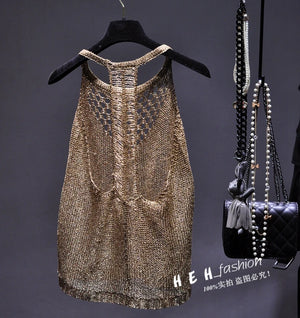 a Summer sexy hollow out knitted camis women shiny bling bling sequined tanks tops women shiny sequins tanks gold camis tops