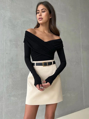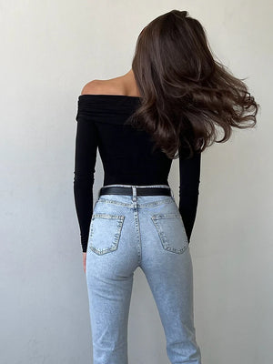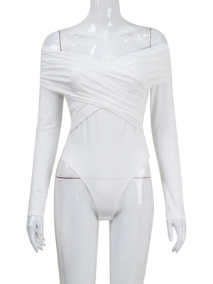 Ahagaga Fashion Solid Sexy Bodysuits Women Elegant Streetwear Long Sleeve Casual Slim Sheath Rompers Cross Folds T Shirts Tops