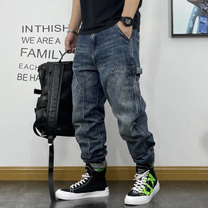 American Fashion Hip Hop Cargo Jeans Streetwear Skateboard Harem Trousers Men Clothing Japanese Harajuku Denim Casual Pants Male