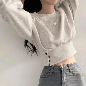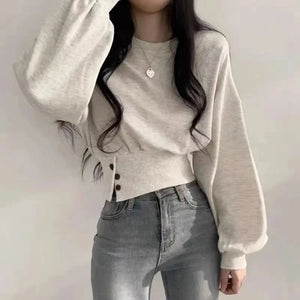 Autumn Women Solid O-Neck Slim Crop Top Lantern Sleeve With Button  Sweat Casual Hip-Hop Sporty Pullover Sweet Chic Street Wear