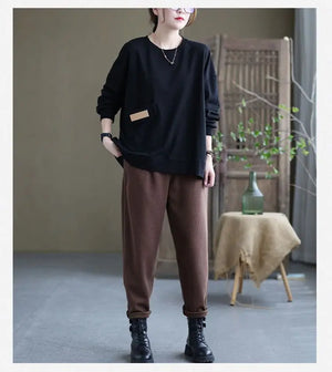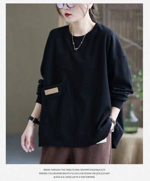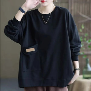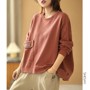 Home Autumn Women Trendy Simple Casual Oversize Streetwear Cotton Sweatshirt Y2K Female O Neck Long Sleeve Solid Pocket Pullover Tops