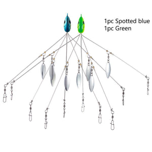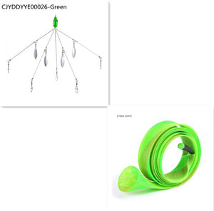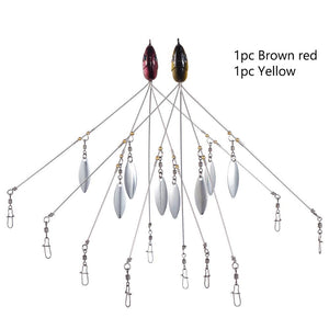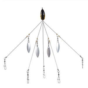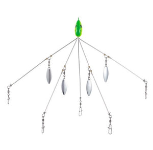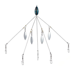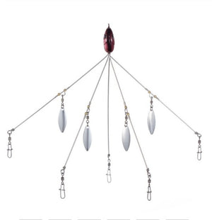 This umbrella rig is made from high quality material which is durable, sturdy and long-lasting. Equipped with 5 swivels, it allows an access to 5 fishing hooks. Metal sequins flash to attract fish. Lightweight to carry, a great addition to your fishing tools. You are worth it!