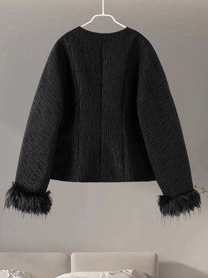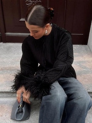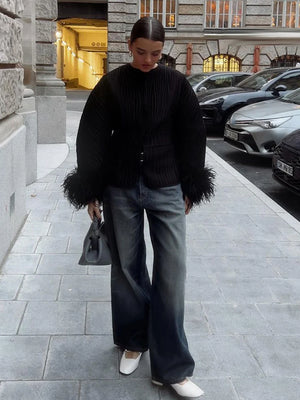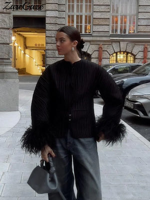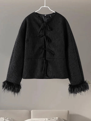 Black Feathers Cuffs Lace Up Quilted Coats Women Loose O-neck Long Sleeve Cotton-padded Jacket 2024 Autumn Winter Patchwork Coat