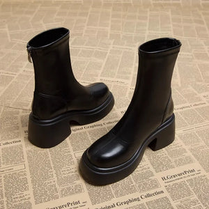 Black Platform Women Ankle Boots Fashion Soft Leather Shoes Autumn Winter Thick Heel Women's Short Booties