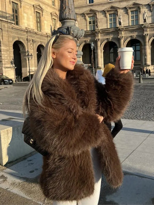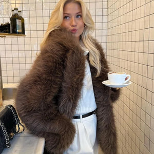Brown Imitation Fur Coat Winter New Thick Warm Suit Collar Coats Medium Long Loose Women Elegant Socialite Female Plush Overcoat