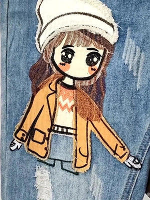 6537 Cartoon Litter Girl Embroidery Denim Pants For Women Trendy Hole Casual High Waist Breeches Pockets Mom Harem Blue Jeans LFFMHMT