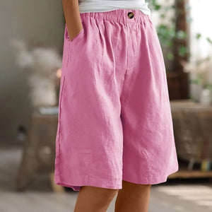 Women's Fashion Solid Color Pants Pocket Button Up Capris Loose Elastic Waist Cotton Linen Shorts