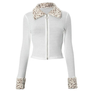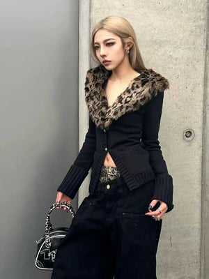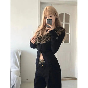 DEEPTOWN Leopard Cardigan Women Japanese Gyaru V-neck Long Sleeve Streetwear Slim Sexy Cardigan Sweater Y2k Vintage Top Autuam