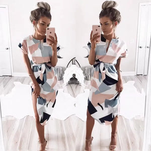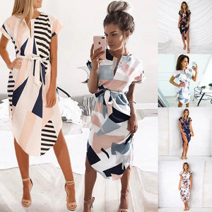 Elegant dress for women, short sleeve, V neck, belt tunic, geometry print, irregular, Office, European and American, summer