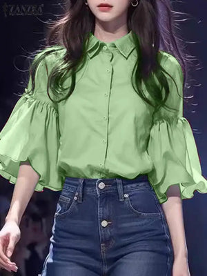 Elegant Women Chiffon Shirt Chic Ruffle 3/4 Sleeve Buttons Blouse Solid Luxury Lapel Neck Tops Fashion Lace-up Blusas