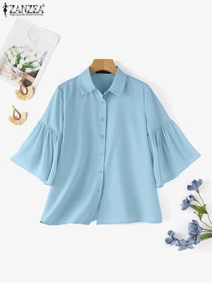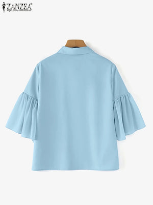 Home Elegant Women Chiffon Shirt Chic Ruffle 3/4 Sleeve Buttons Blouse Solid Luxury Lapel Neck Tops Fashion Lace-up Blusas
